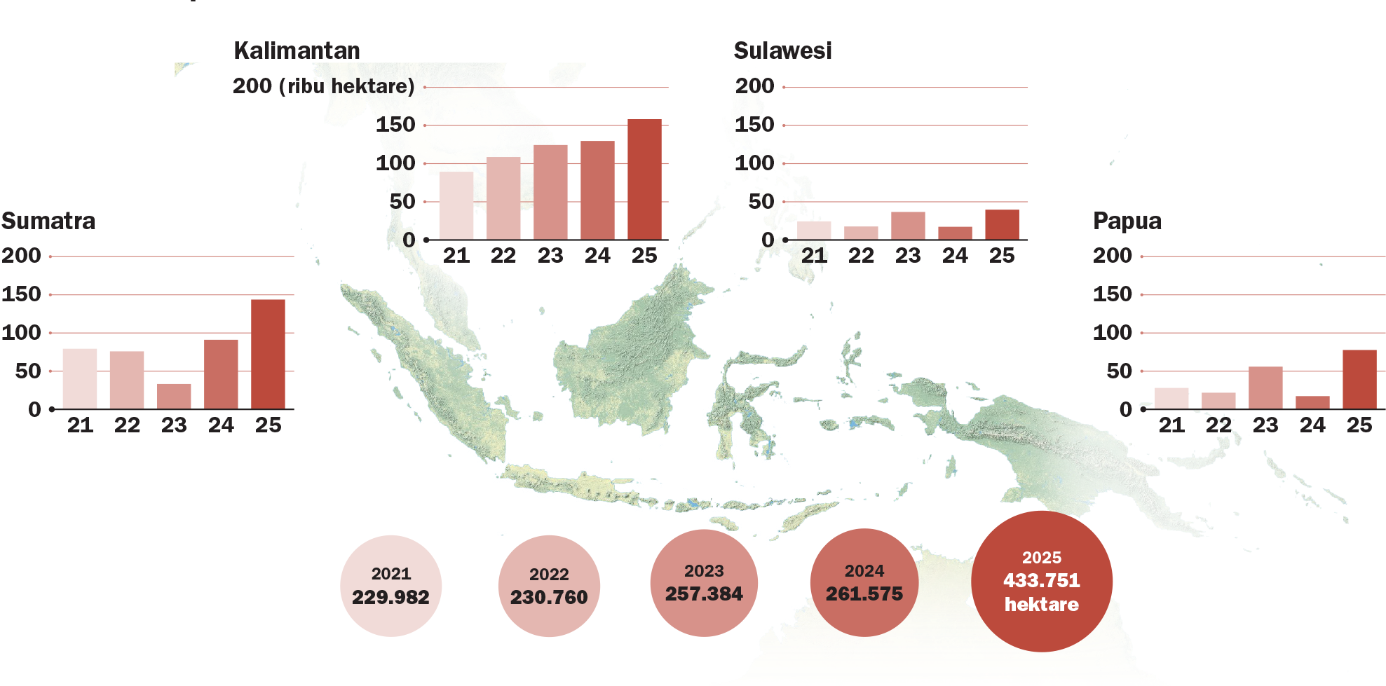 Deforestation on Indonesia’s major islands, 2021–2025 (in hectares)