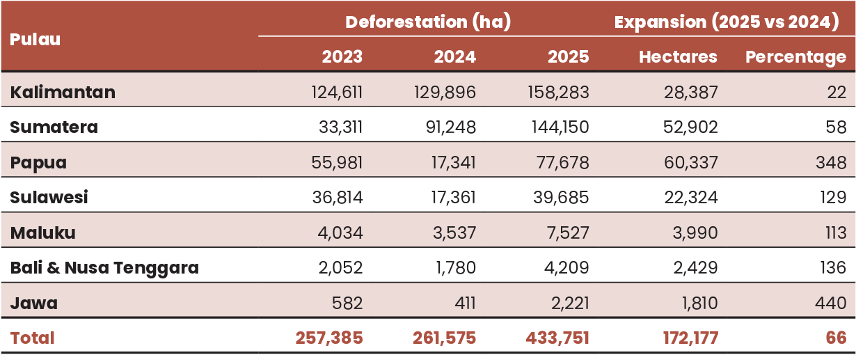 Kalimantan once again recorded the greatest extent of deforestation, making it the region with the highest deforestation rate for consecutive years since 2013. In 2025, all of Indonesia’s large islands experienced expansions in deforestation, with Papua seeing the largest increase of 60,337 hectares compared to 2024. The largest percentage increase occurred on Java, where deforestation rose by 440% compared to 2024.