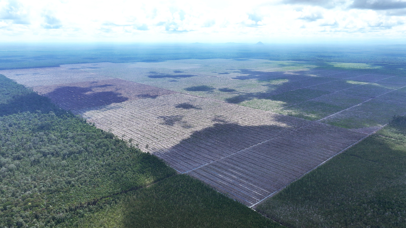 Deforestation for oil palm development in the PT Borneo International Anugerah concession in Putussibau, Kapuas Hulu, West Kalimantan. Photo: ©Auriga Nusantara, Juni 2025.