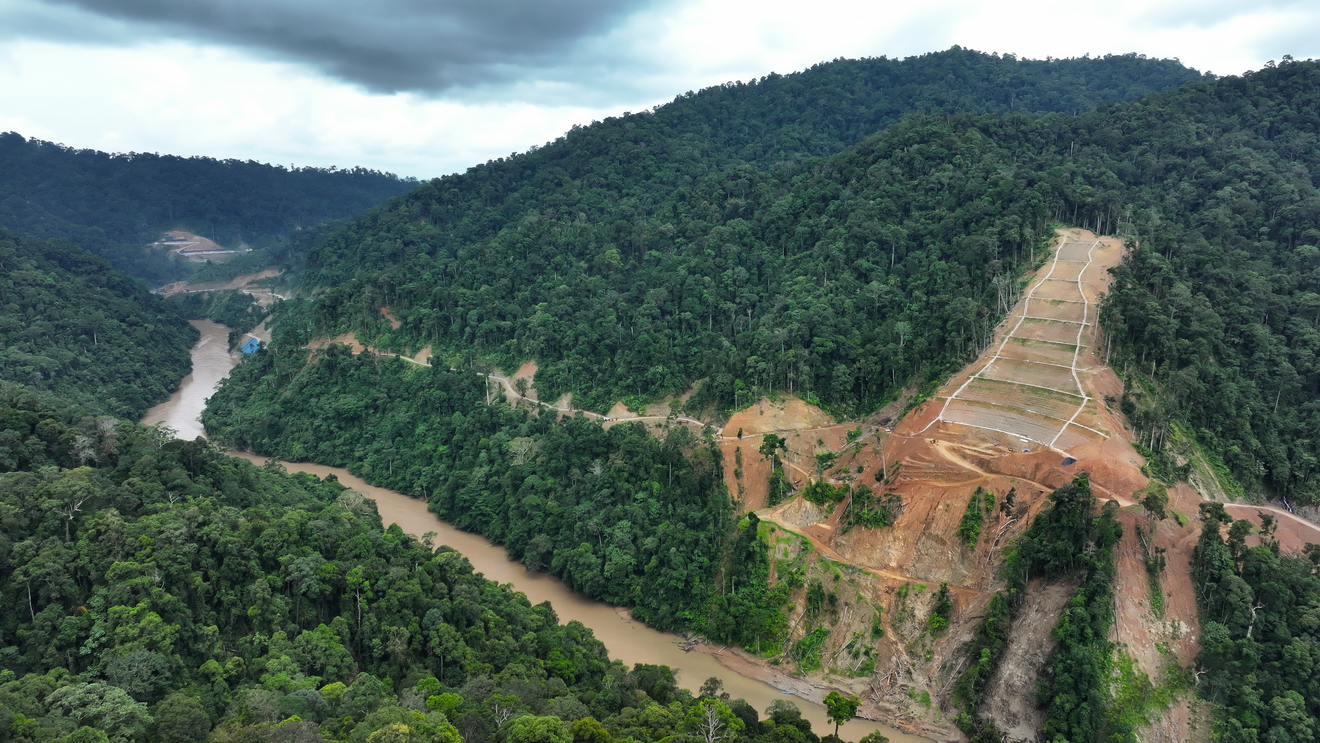 Deforestation for the construction of a hydro-electric power plant to supply electricity to the Indonesia Green Industry Estate (KIHI) strategic national project in Tanah Kuning Mangkupadi, Bulungan, North Kalimantan. Photo: ©Auriga Nusantara, Oktober 2025.